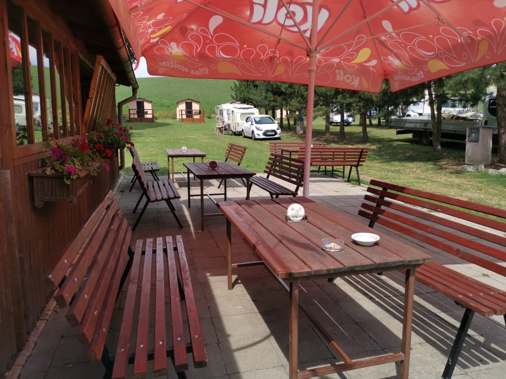 Možnost něco si koupit na jídlo je v kempu silně omezena. I restaurace o kus dále, vedle silnice, měla v tu dobu ještě zavřeno. Dětské hřiště nic moc, lze-li tak nazývat skluzavku a malé pískoviště s houpacím koněm. Pingpongový stůl už asi také pamatoval lepší časy.