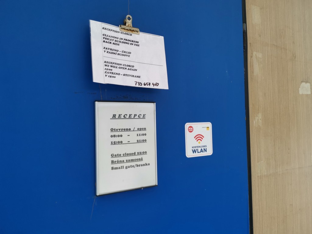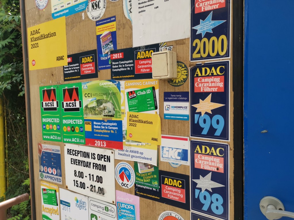 I tento kemp toho hodně pamatuje – i když působí přeci jen více moderněji než Oáza. Recepce z likusaku, přes poledne zavřená a oblepena nálepkami. Možná pokus o dojem světovosti, ale takový divný, navíc se v té záplavě ztrácí užitečné informace. Nicméně všechny důležité věci jsou na nástěnce před recepcí. Ale opět, jej jich tam moc a jsou nepřehledné. V době mé návštěvy a zavřené recepci přijel pár z Francie a měl problémy se zorientovat, jak to v kempu chodí – tady je určitě prostor na zlepšení, stejně tak ceník působí až příliš složitě a neurčitě – obytné auto 1,2, XL, Stan 1,2 ,