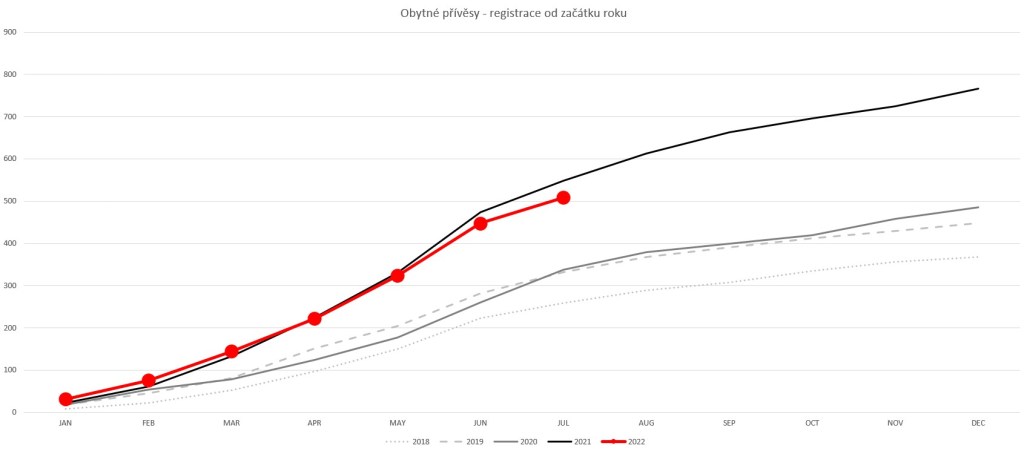 V červenci 2022 se registrovalo jako nových pouhých 127obytných aut a 61 obytných přívěsů. Pokles registrací není překvapením, docházelo k němu v červenci prakticky každý rok. Ale tak hluboký propad asi očekáván nebyl, meziměsíčně klesly počty registrovaných nových vozidel na polovinu, meziročně pak o 42% u obytných aut a o 19% u přívěsů.