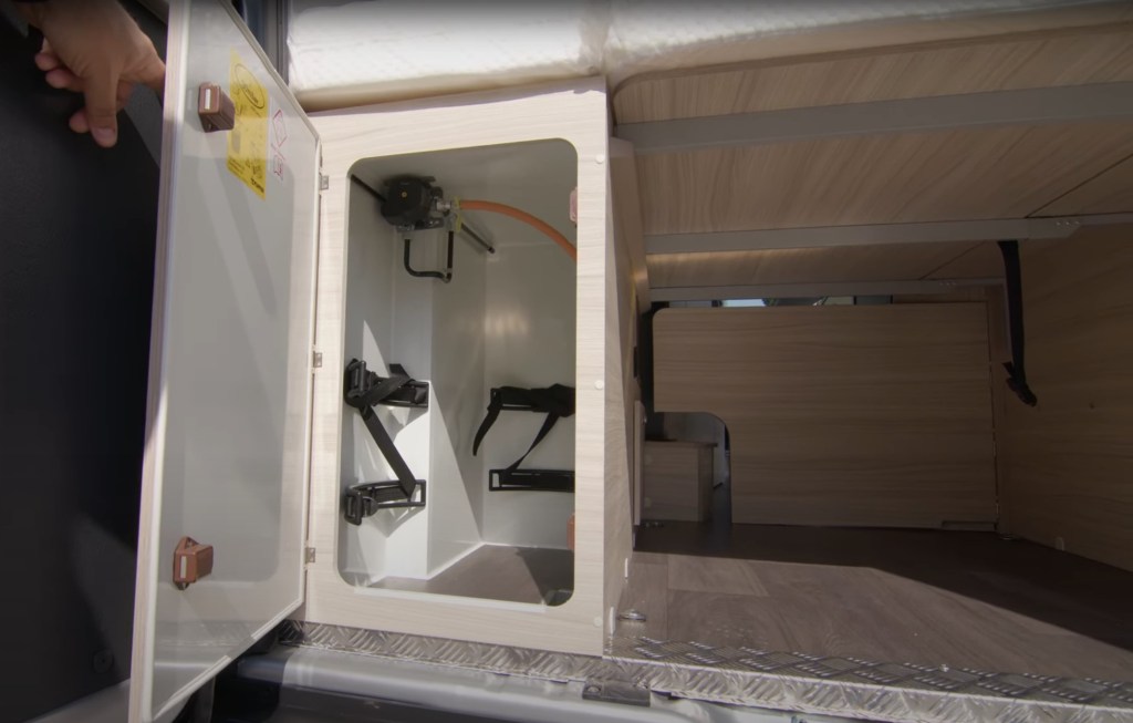 Příčné lůžko v zadní části lze uprostřed sklopit, takže prostor pod ním lze využít třeba pro přepravu jízdních kol (kam s nimi ale přes noc?), na obou stranách nad postelí jsou pak další úložné prostory ve formě skříněk.