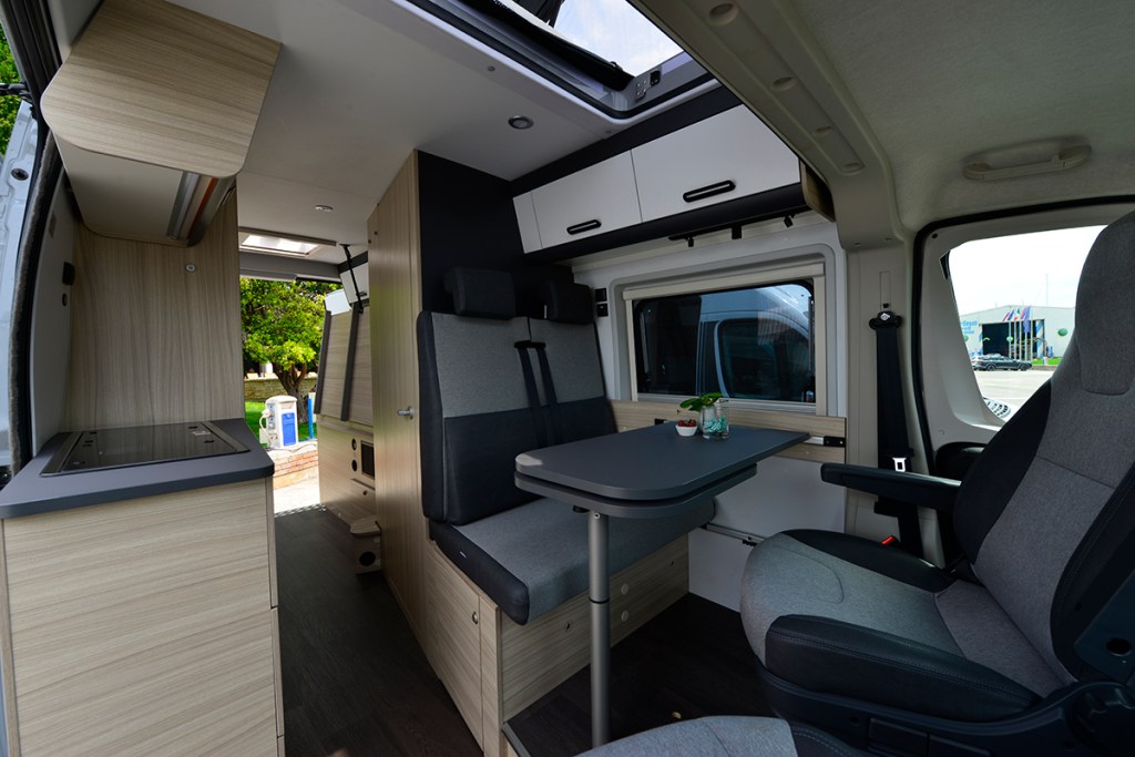 Ty lze najít i nad sezením v druhé řadě vředu i nad kuchyňským blokem. Tomu dominuje dřez, dvouplotýnkový plynový sporák (Dometic) a kompresorová lednice o objemu 84 litrů. Objem lednice lze zvýšit na 138 litru za poplatek €399. Dle fotek se zdá, že se bude v základu jednat o lednici Thetford T2090 a za příplatek pak o provedení T2138.