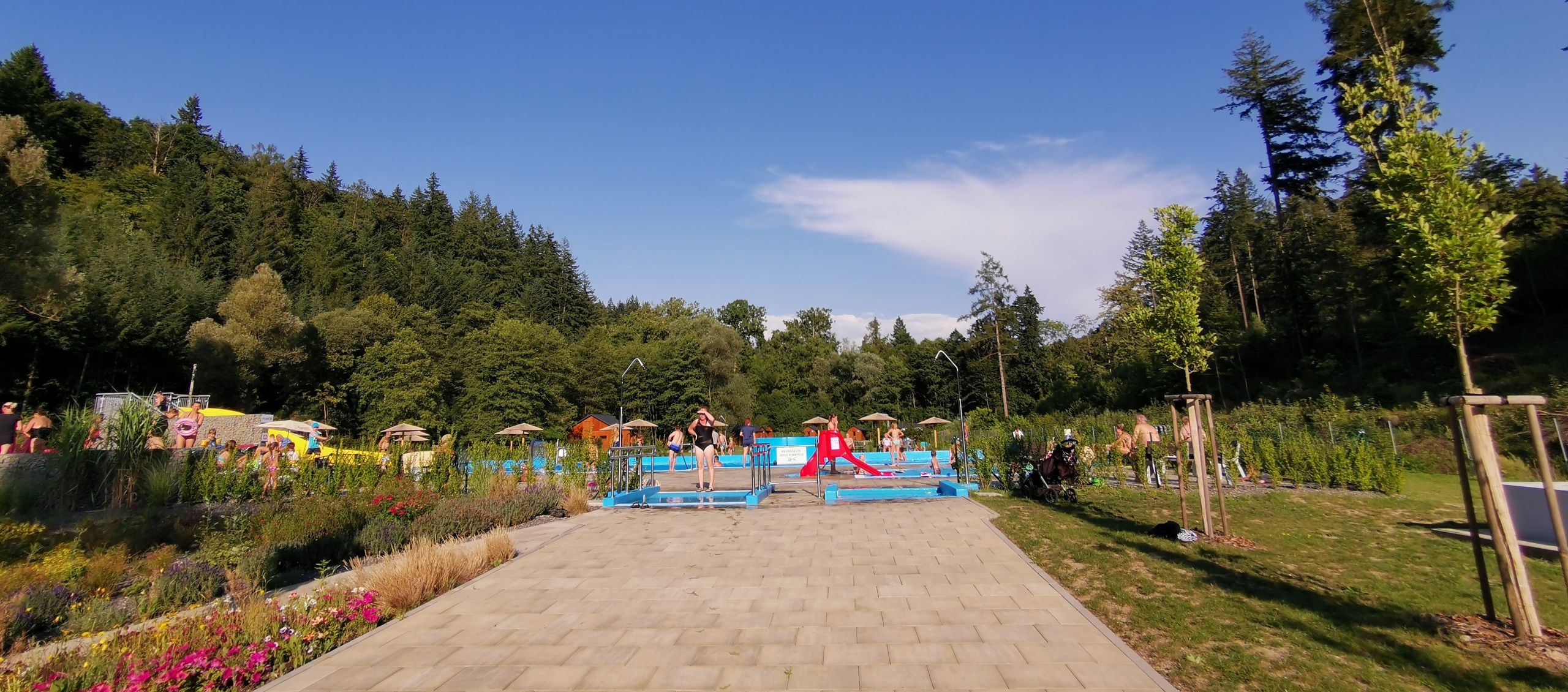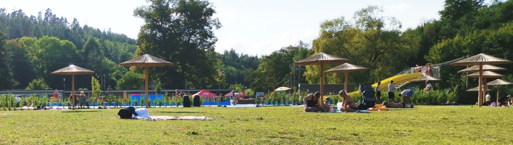 Nepřehlédnutelnou dominantou jsou rákosové slunečníky, rozmístěné po dvou stranách bazénu a které dostatečně nahrazují chybějící stín od vzrostlejší zeleně. Na své si tady přijdou jak malí, tak i velcí plavci, zážitkové části dominuje velká žlutá klouzačka, stačící k zabavení zejména mládeže.