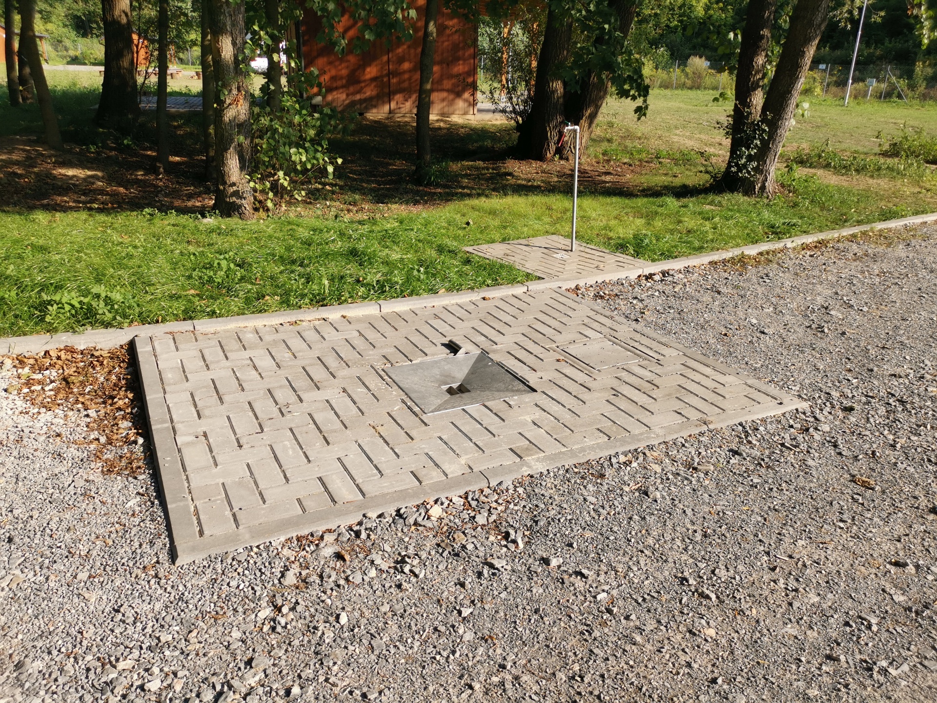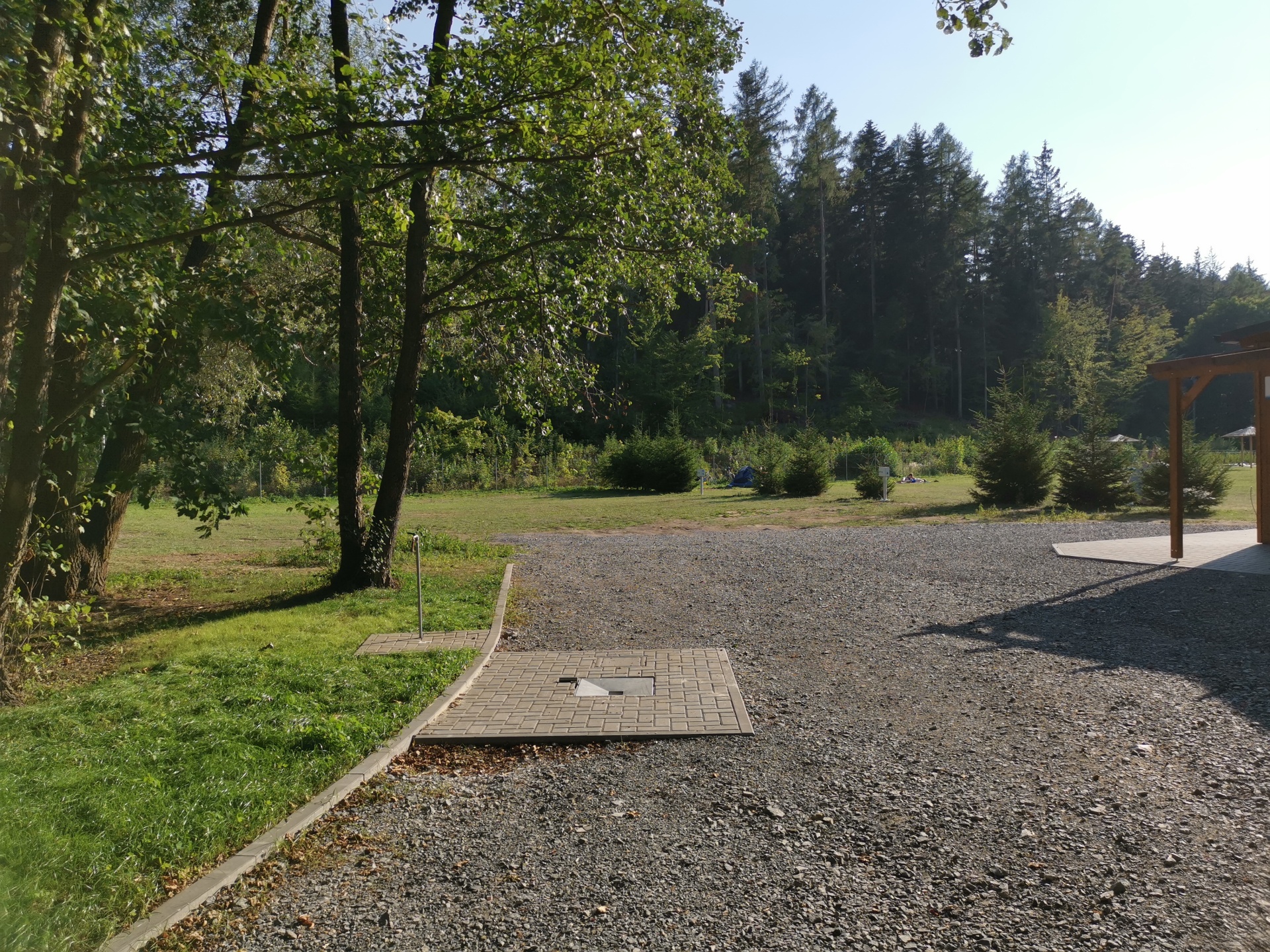 Náměstíčko přes sanitární budovou pak doplňuje servisní místo pro obytná vozidla. Jedná se o vozovkovou vpusť pro odpad s vyvedenou pitnou vodou a vodou pro oplach. Umístnění se povedlo, je zde dostatek místa na manévrování a celá část je velmi šikovně oddělena od prostoru pro kempování i koupání.