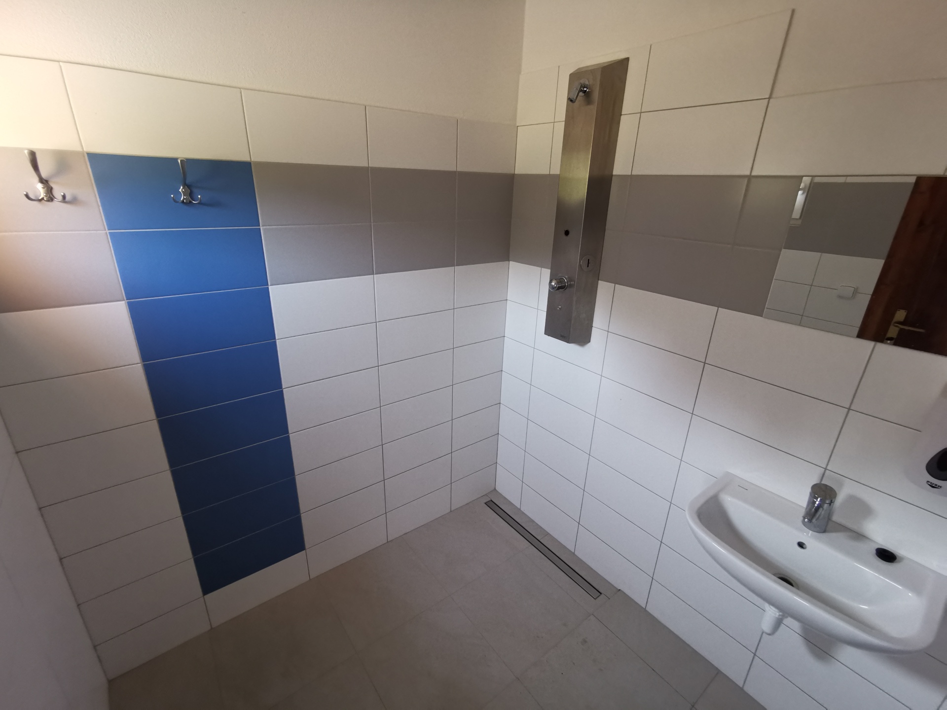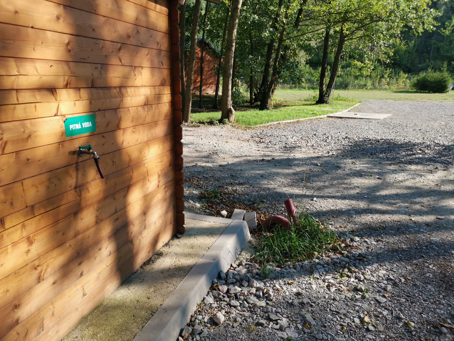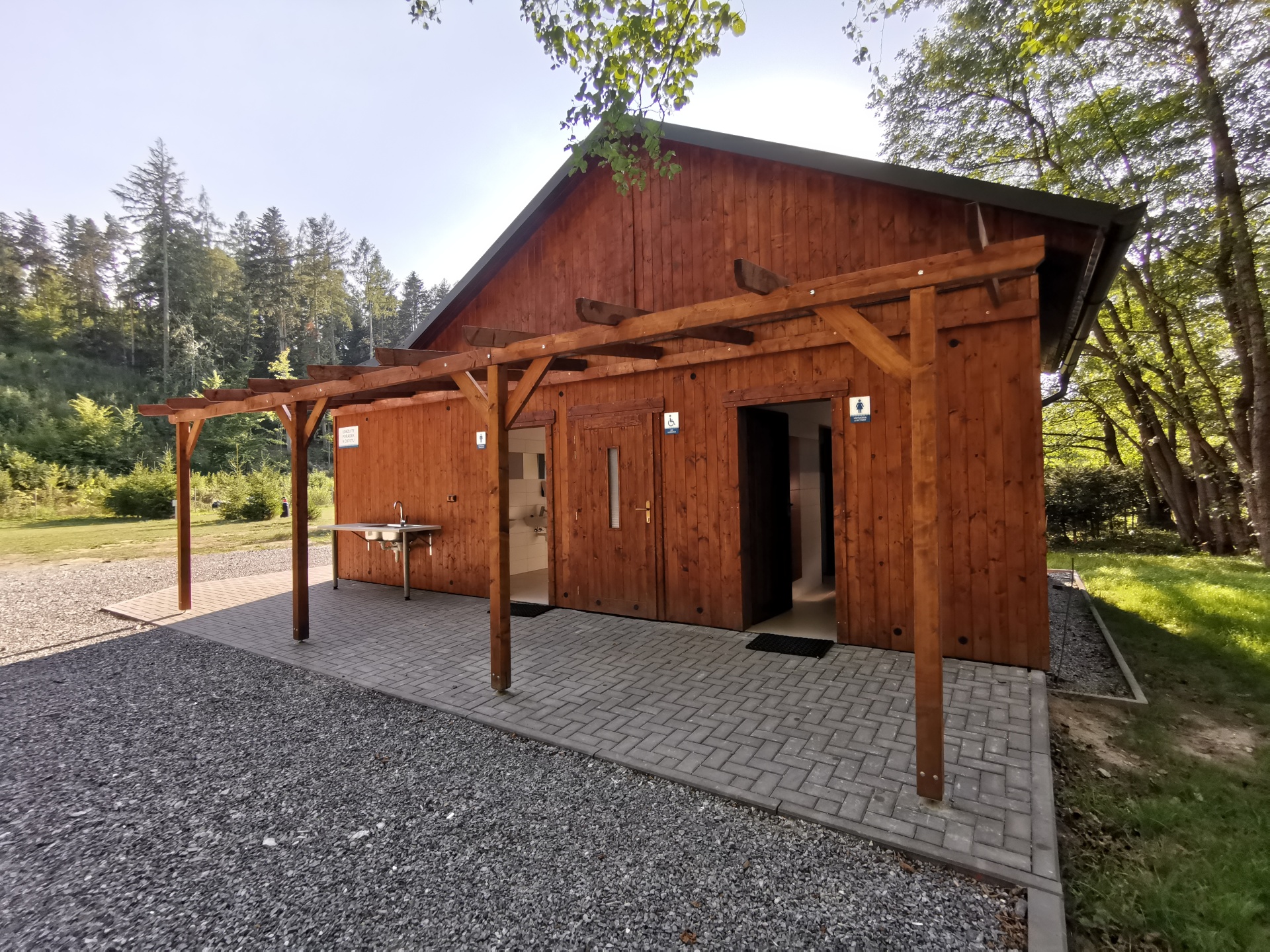 Před vjezdem k samotným kempovacím místům je pak sanitární budova, se záchody, sprchami (jedna samostatná sprcha pro muže a ženy) a venkovním pultem pro umývání nádobí.