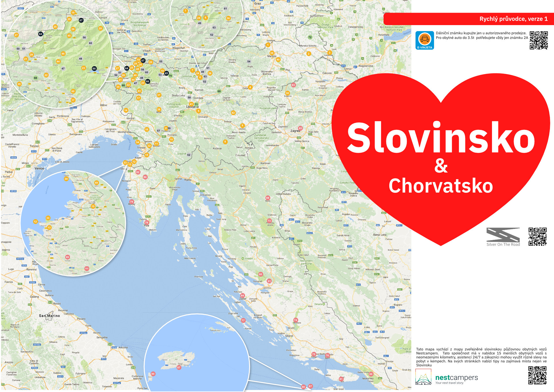 Vybrané body vychází z mapky, kterou pro své klienty připravila slovinská půjčovna nestcampers. Ta má v nabídce patnáctku menších obytných vozů, zejména menší dodávky se spací vestavbou a soustředí se především na zájemce o cestování po Slovinsku, případně Chorvatsku. Těm nabízí nejen zmíněnou mapu zajímavých míst, ale i možnost uplatnit nějaké slevy při ubytování v kempech či návštěvě turistických atrakcí.