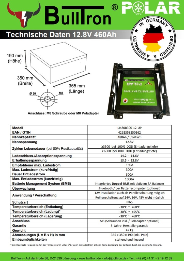 Jak název napovídá, nabízí tento akumulátor kapacitu 480 Ah a vejde se celý pod sedadlo vozidla na bázi Ducato. Tato baterie má BMS, komunikuje přes Bluetooth, aktivní balancér a integrovaný ohřev (odtud přídomek Polar v názvu). BMS trvale chrání jednotlivé články i celou baterii před přepětím/podpětím, přehřátím/podhřátím, přetížením a zkratem (automatické vypnutí bez poškození).