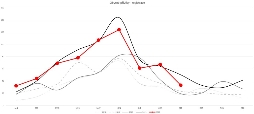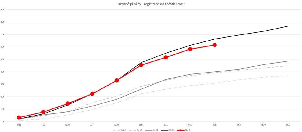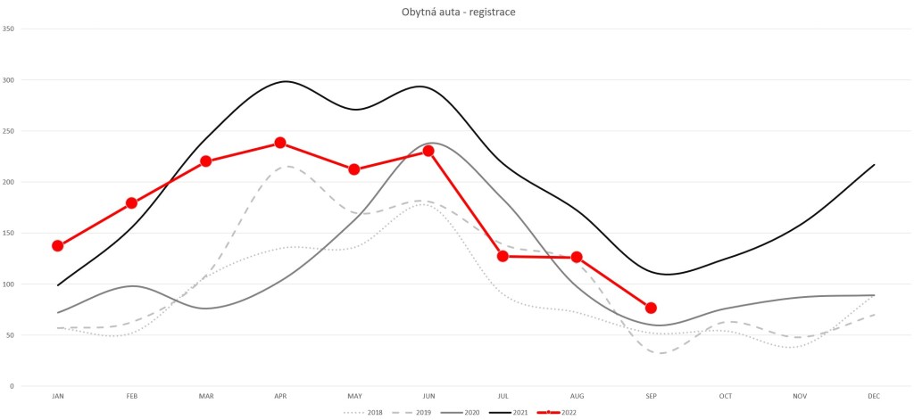 V září roku 2022 se jako nové registrovalo jen 76 obytných aut a 33 přívěsů. To je v porovnání se zářím rekordního roku 2021 propad o 32%, respektive 34%, ale stále je to více než kdykoliv předtím tímto výjimečným rokem. Celkově se tak u nás za prvních devět měsíců registrovalo 1 545 zcela nových obytných aut a 615 obytných přívěsů (pod pojmem zcela nový se myslí vozidlo poprvé registrované v rámci EU, tedy přímo od výrobce, bez dřívějšího předchozího majitele).