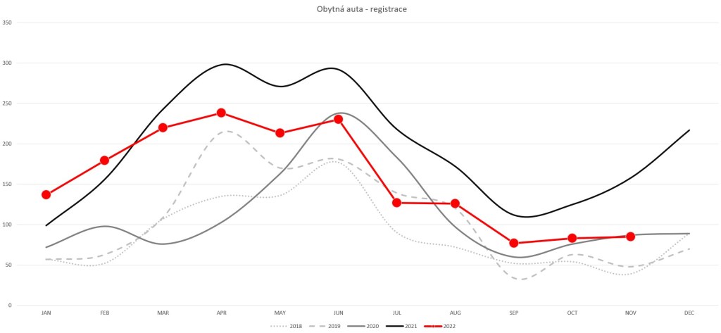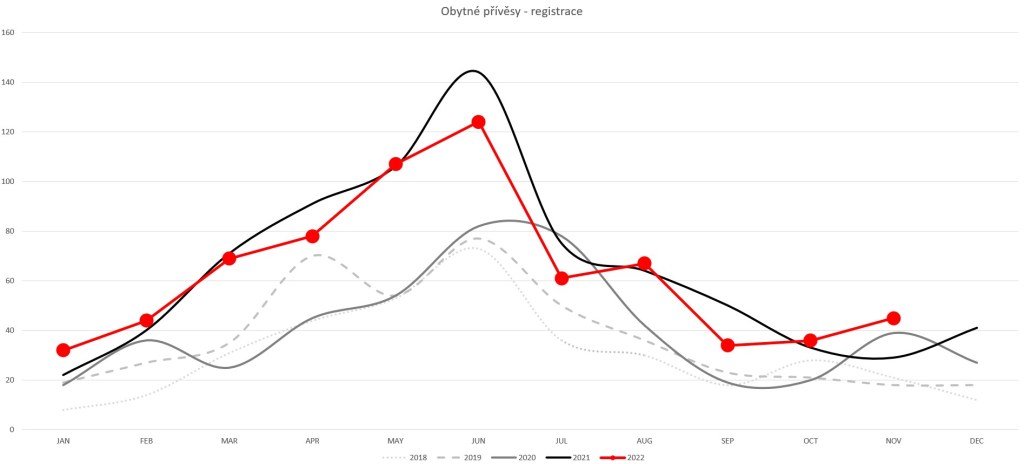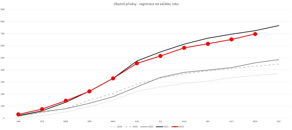 V listopadu 2022 se jako nových registrovalo v České republice 85 obytných aut a 45 přívěsů. V porovnání se stejným měsícem roku 2021 to znamená 46% pokles u obytných automobilů, ale 55% vzestup u přívěsů. Zejména přívěsy jsou velkým překvapením, listopad je již šestým měsícem tohoto roku, kdy počet registrací překonal stejné období z rekordního roku 2021. Jedná se zatím o rekordní počet obytných vozidle registrovaných v listopadu. Ani u obytných aut se nejedná v širším pohledu o žádný dramatický pokles. Listopad 2021 byl velmi výjimečný a v dobách před covidem se v tomto měsíci registrovaly nanejvýše čtyři desítky aut. Takže 85 registrovaných nových obytných aut lze považovat za velmi slušný výsledek svědčící o neutuchajícím zájmu o obytná vozidla. Pro porovnání, v listopadu 2021 se do registru zapsalo 158 obytných aut a jen 29 přívěsů, v listopadu roku 2019 se pak jednalo o 48, respektive 18 vozidel.