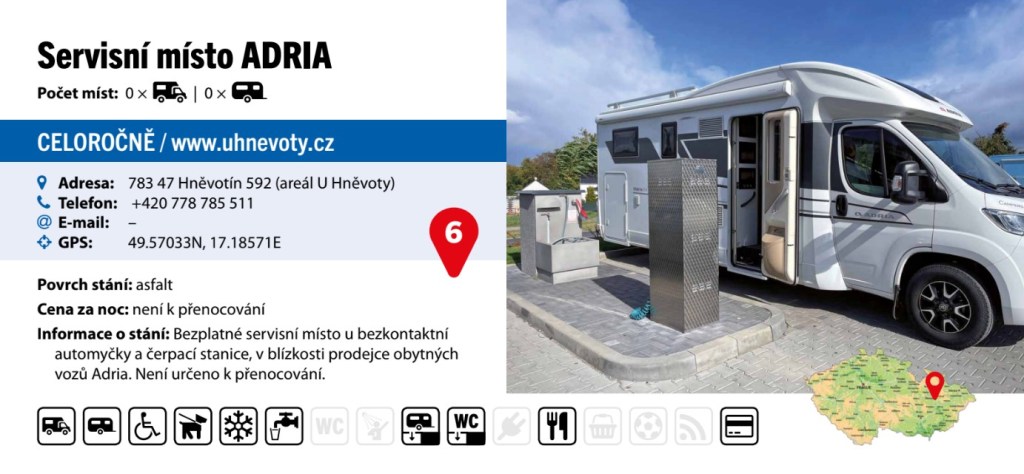 Servisní místo pro obytná vozidla je v rámci služeb, poskytovaných v rámci Multiparku U Hněvoty, zcela logickou službou. Navíc, vznik servisního místa v blízkosti autorizovaného prodejce obytných vozidel by měl být samozřejmostí, pokud to podmínky jen trochu umožňují. Jsme také rádi, že toto místo již je uvedeno v aktuálním přehledu karavanových stání a servisních míst Asociace kempování a karavaningu ČR pro rok 2023.