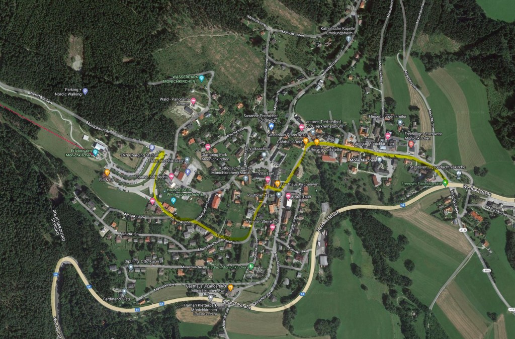 Příjezd směrem z hlavní silnice č.54 je trochu strmý s pár ostrými zatáčkami. Mne příjezd komplikovala velmi hustá mlha, která umožňovala viditelnost doslova na pár metrů. Začala náhle po odbočení z hlavní silnice směrem do obce. Musel jsem si přepnout na Google Maps satelitní pohled, abych věděl, kde vlastně jsem a našel i vhodné místo na parkovišti. Pár minut po příjezdu a zaparkování se náhle rozplynula.