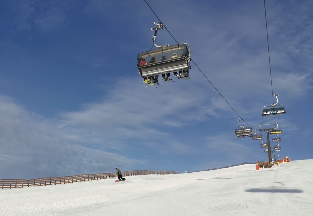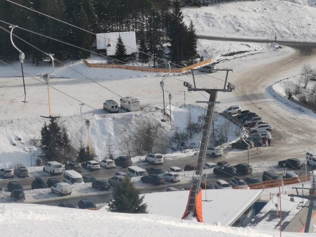 Stejný postup jsme použili tady. A ráno jsem se samozřejmě na pokladně ujistil, že je stání na parkovišti v pořádku. Bylo, milá slečna mi poradila zůstat přesně tam, kde jsme už stáli. K pokladnám je to jen kousek a nad nimi je už nástup na první ze dvou šesti sedaček tohoto skiareálu.