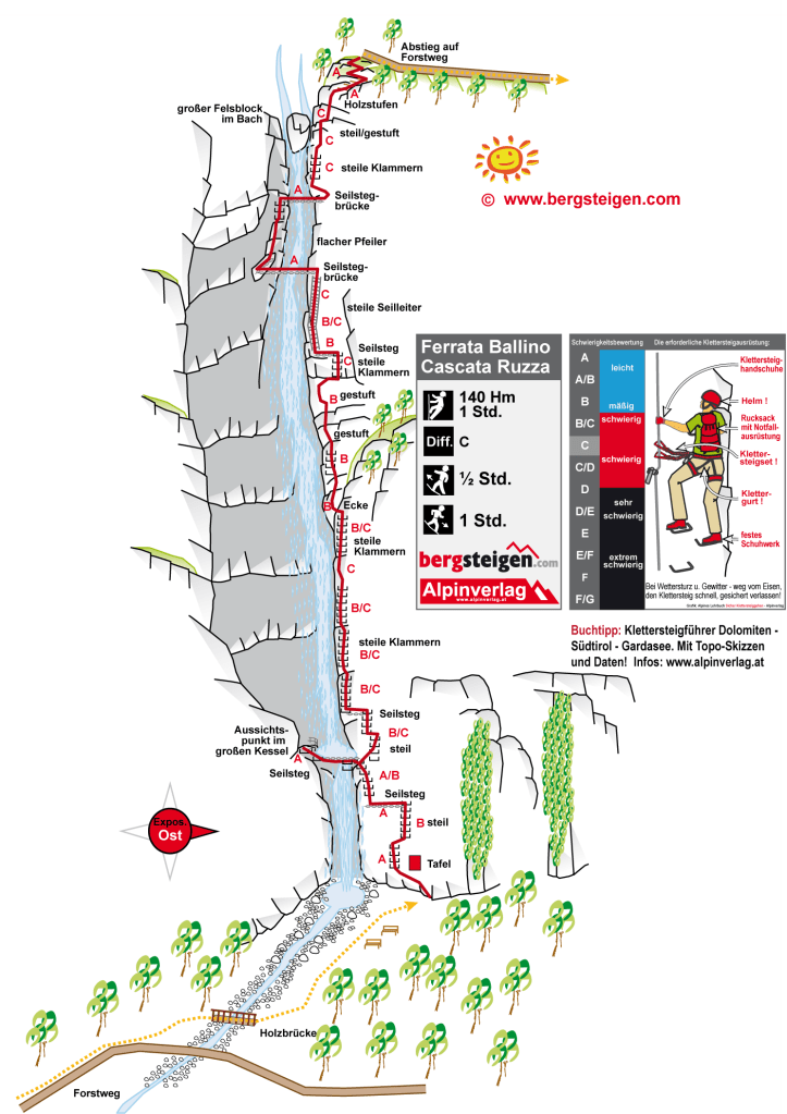 Zde je ukázka topo-map ze stránek Bergsteigen, všimněte si základních informací o náročnosti, výškových metrech či době nástupu a sestupu: