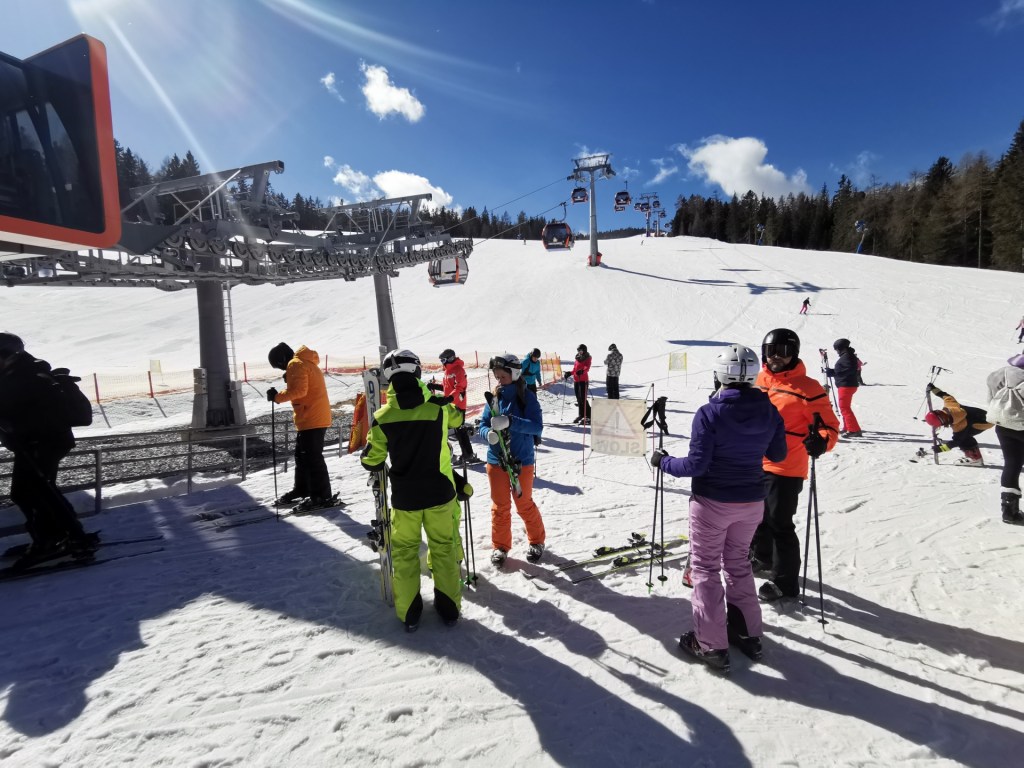 Vyrazili jsme v pátek večer a v pohodě dojeli až na spodní parkoviště ski arealu Kreischberg. I průjezd Vídní byl hladký, na dálnicích se nikde nevážilo ani nekontrolovalo, dálniční známku jsme měli koupenou přes obchod Asfinagu. Počasí na další den slibovalo sluníčko a spolu s námi tady stálo dalších sedm obytek. Během noci ale zesiloval vítr. Ráno a dopoledne tak bylo super slunečné počasí, jen tedy foukalo a čím blíže k hřebenu, tím více. Převážná část střediska proto byla uzavřena. Nejezdily sedačky na obou krajích střediska a valná část návštěvníků se soustředila do prostřední části střediska. Což s sebou neslo i fronty na obě fungující kabinkové lanovky.
