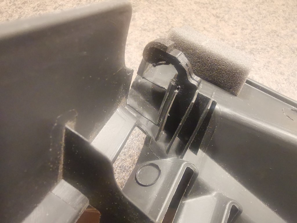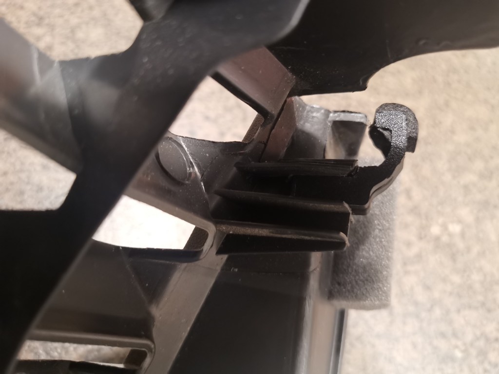 Díky 3D tiskárně a dostupným programům nebyl problém si chybějící část vymodelovat a vytisknout. Tenhle náhradní dílek jsem si vymodeloval tak, že je nutné jen zlomené místo zbrousit a pak stačí vytištěný dílek jen nasadit. Není potřeba jej ani lepit a při zběžném pohledu si opravy asi ani nikdo nevšimne. Dílek je možné i vyjmout, byť k tomu asi není žádný důvod. Na kraje jsem si navíc ještě nalepil kus těsnění, aby plasty eventuálně zbytečně neklepaly, ale to spíše z preventivních důvodů.