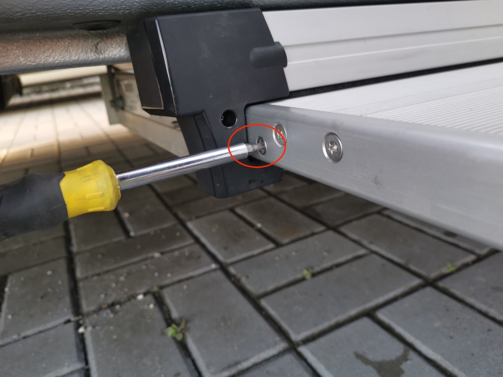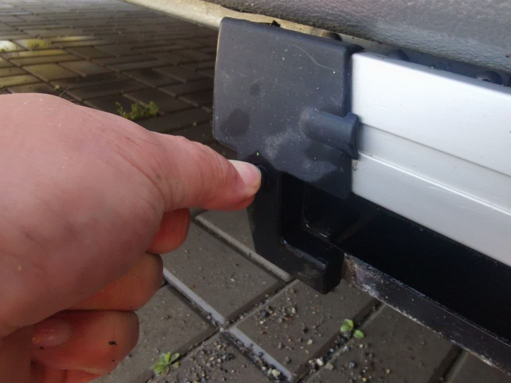 U plastových bočnic odstranit krytku šroubu a vyšroubovat vrut.Plastové bočnice je tak možné vyjmout a tím se uvolní i horní hliníková lišta lišta schůdku: