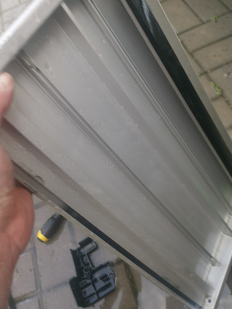 Vše smontovat zpět, postup je opačný, tj. zasune se plastová deska, poté přední kovový rámeček, přední hliníková lišta, bočnice a následně se zasune zpět pohyblivá část schůdku, usadí se a zašroubují ze spodní část plastové dorazy a táhla se přes závlačku chytnou k pohyblivé části.