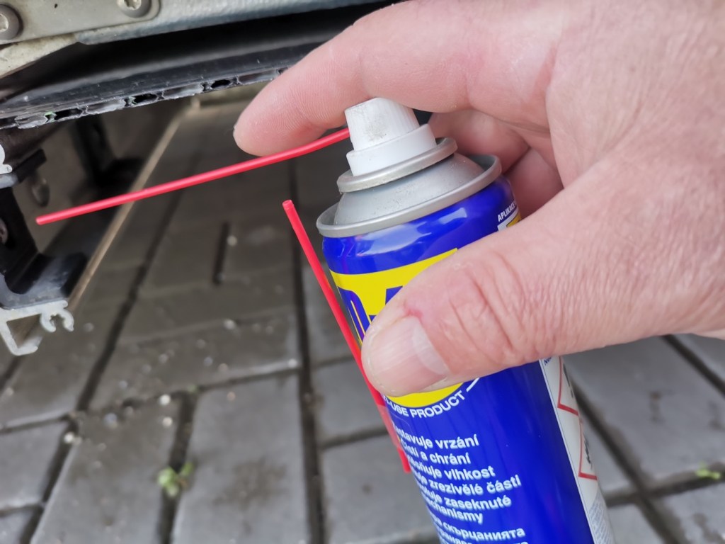 Aktualizace: na základě diskuze na fb skupině Profi obytné vestavby a vše kolem toho je možné a asi i vhodnější použít místo „obyčejné“ WD-40 i jiné mazivo, s teflonem. Lze vyzkoušet WD-40 s PTFE a nebo diskutující doporučil sprej Weldtite TF2
