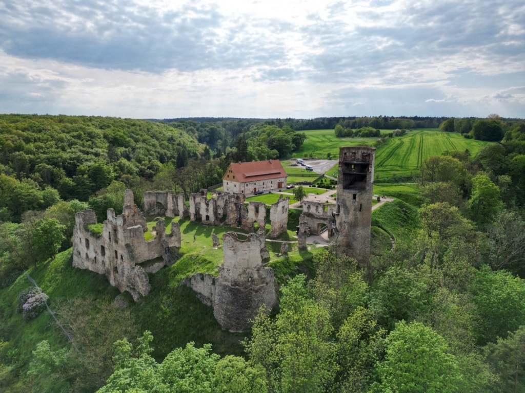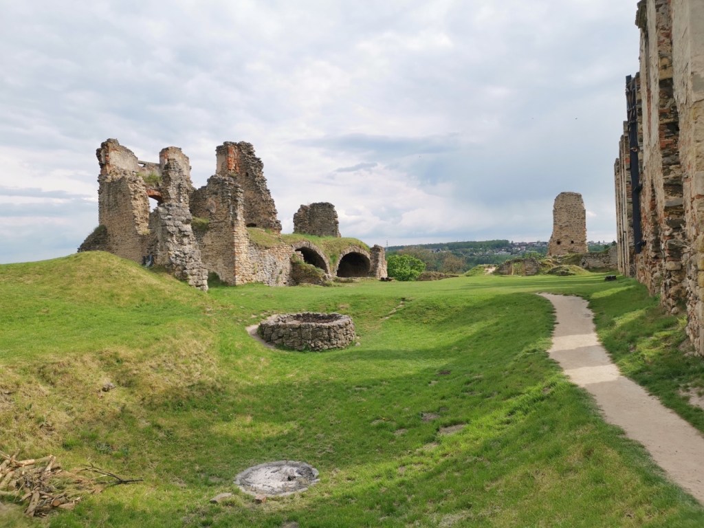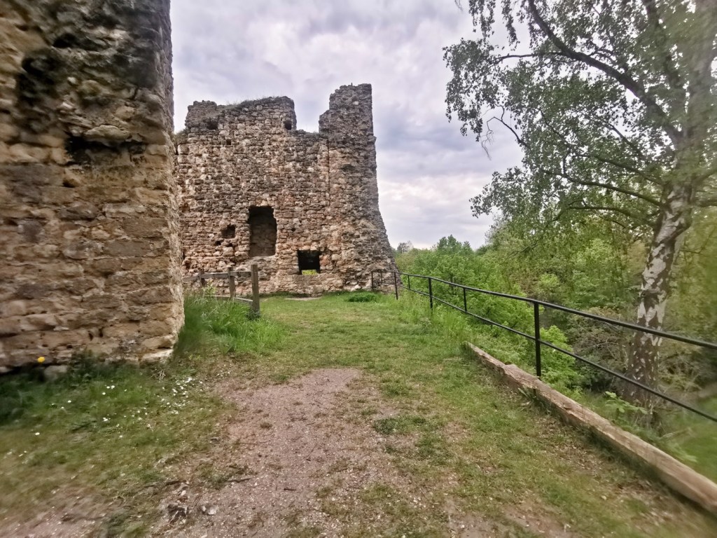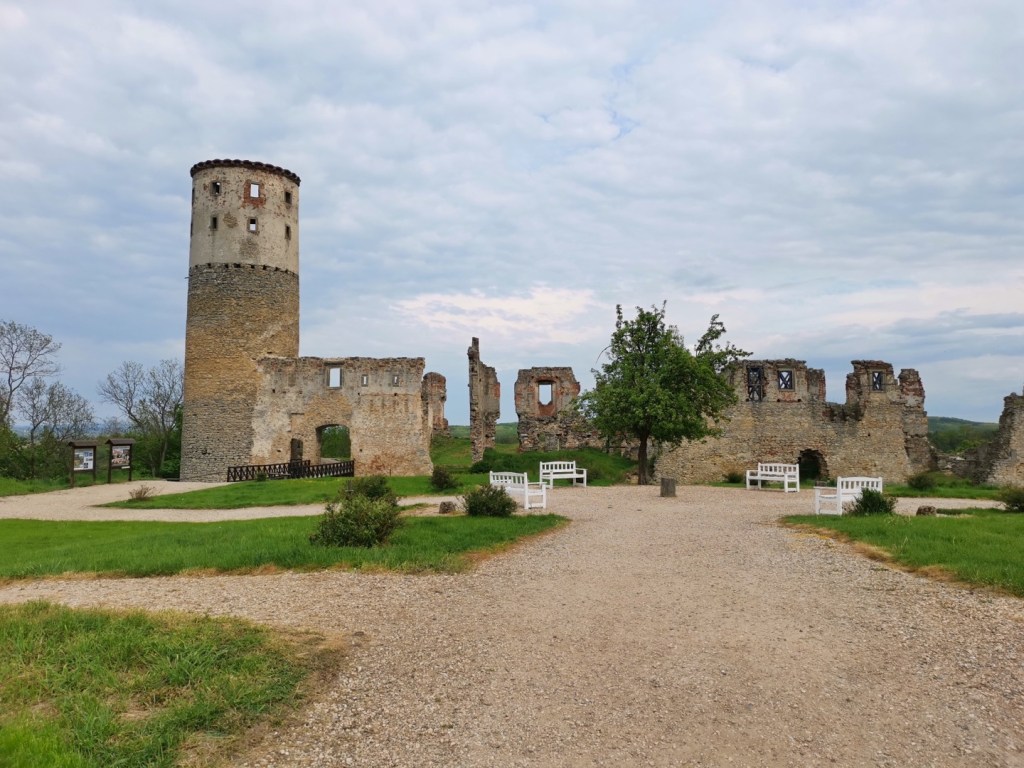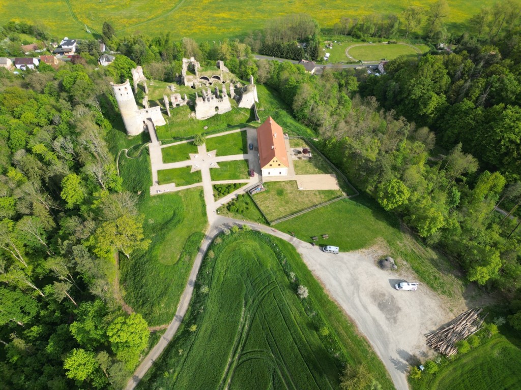 Upřímně, tohle je v porovnání s Michalovici jiná liga. Mnohem pěknější, rozsáhlejší a zachovalejší – tedy jestli jde o něčem takovém v souvislosti se zříceninou mluvit. Lze parkovat buď dole, podél silnice, ale u zříceniny je i poměrně velké parkoviště. Není rovné, ale pokud by tady chtěl někdo přespat, tak jde nalézt místa, kde to bude v pořádku. Příjezd je možný dvěma cestami, pro obytný vůz jednoznačně doporučuji modrou trasu – červená je vhodná jen pro osobní auto a pokud by se zde potkaly dva větší vozy, budou mít problém se vyhnout. V obou případech je to cesta zpevněná.