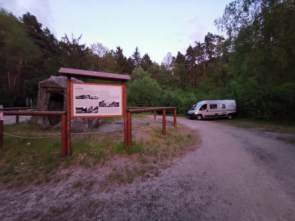 Na západním okraji je několik možností stání, my zvolili parkoviště Dneboh-Drábské světničky. Parkoviště je přes den placené, platí se obsluze kiosku 50 Kč za den. Večer, kdy jsme na místo dorazili, zde bylo prakticky prázdno, takže nebyl problém zaparkovat. Místo není úplně rovné, velká část se mírně svažuje, a je tedy nutné trochu hledat. Což se nám nakonec podařilo a místo, kde jsme stáli, bylo víceméně v rovině. Uprostřed parkovišti je i informační cedule se vzpomínkou na obec Kavčina, zničenou sesuvem půdy v minulém století.