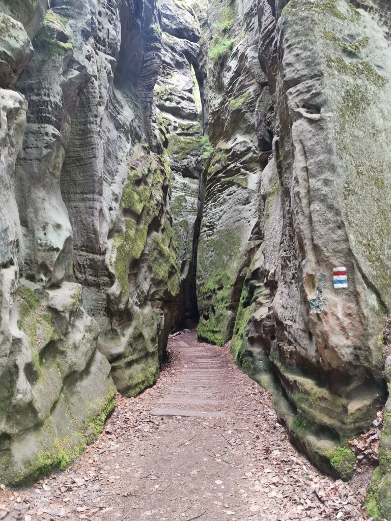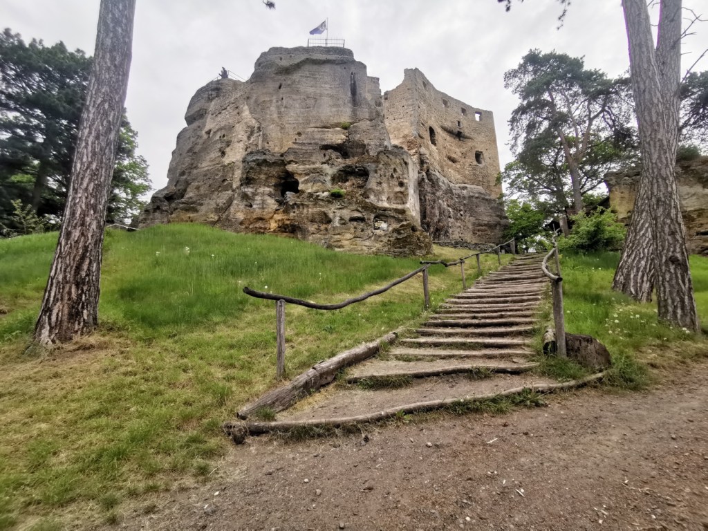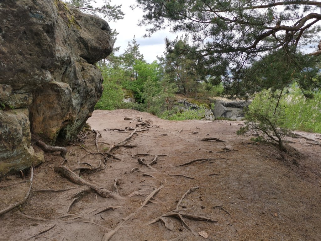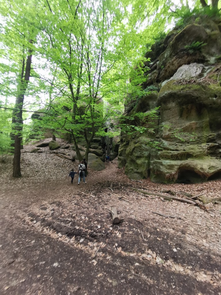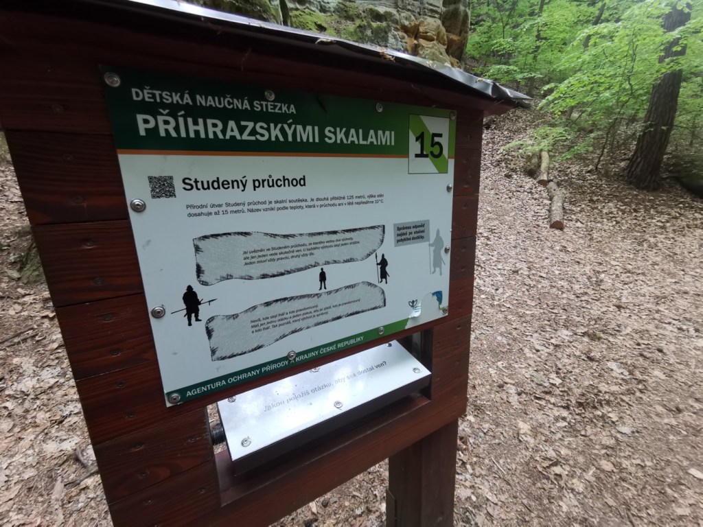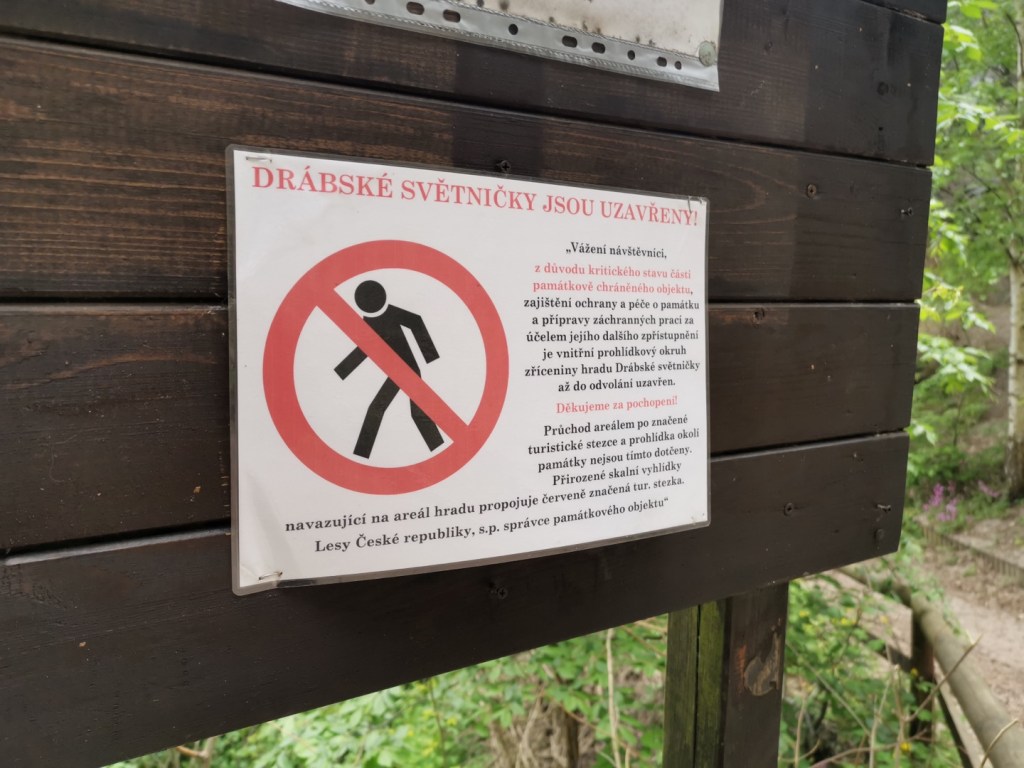 Ráno následujícího dne jsme vyrazili na výlet, směr Drábské světničky. Cesta od parkoviště je prakticky jediným zásadním stoupáním na celé trase. Nepříjemným překvapením byl ale uzavřený výstup na vyhlídku, prý je v havarijním stavu. I když překvapení…kdybychom si přečetli předem všechny informace, tak bychom to věděli. Čeká se zde na rekonstrukci, která by omezila nadměrnému opotřebení povrchu skal pohybem turistů a zároveň opravila nebezpečná místa.