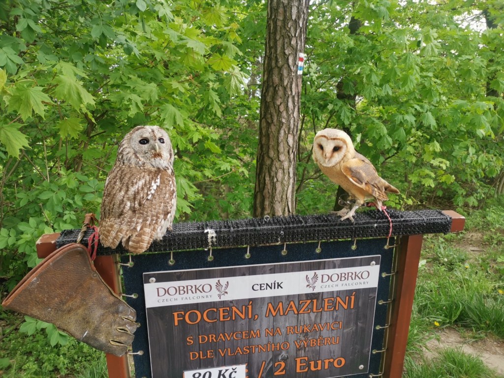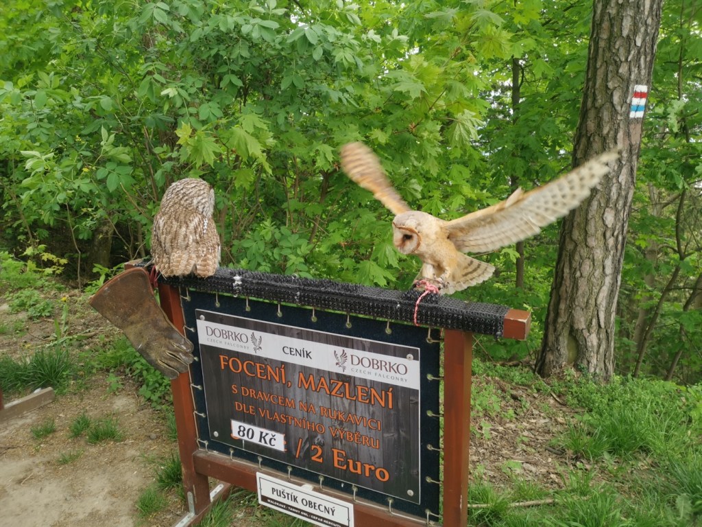 V době naší návštěvy zde probíhala i přehlídka dravců, nicméně ti víceméně podřimovali, jen jeden párek byl aktivní. A nám k návratu zbývala cesta zpět Studeným dolem a Studeným průchodem a poté po červené značce po hraně plošiny pomalu zpět k Drábským světničkám a dolů na parkoviště.
