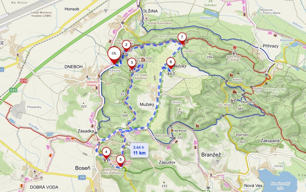 V tomto bodě jsme dosáhli jednoho konce našeho výletu a obrátili se na cestu zpět. Nevraceli jsem se však stejnou cestou, ale tentokrát po zelené, která kopíruje silnici. Prochází obcí Mužský, kde stojí zachovalé roubené domky a která je chráněná jako vesnická památková rezervace. Za koncem obce je pak i vrch Mužský (463 m n. m.) , nejvyšší bod okresu Mladá Boleslav. Je odtud rozhled do okolí. V okolí je hodně sadů, občas i s nějakým pasoucím se dobytkem . Na vrcholu kopce stojí kamenná mohyla připomínající postavení rakouského dělostřelectva během bitvy prusko-rakouské války v roce 1866.