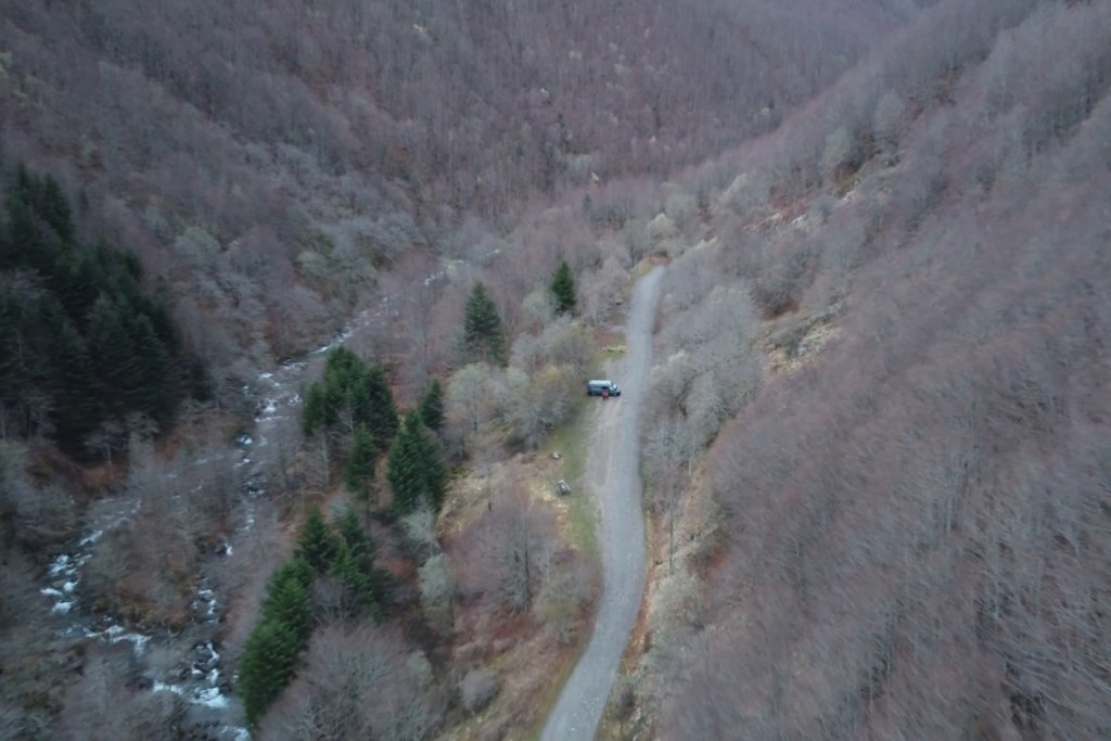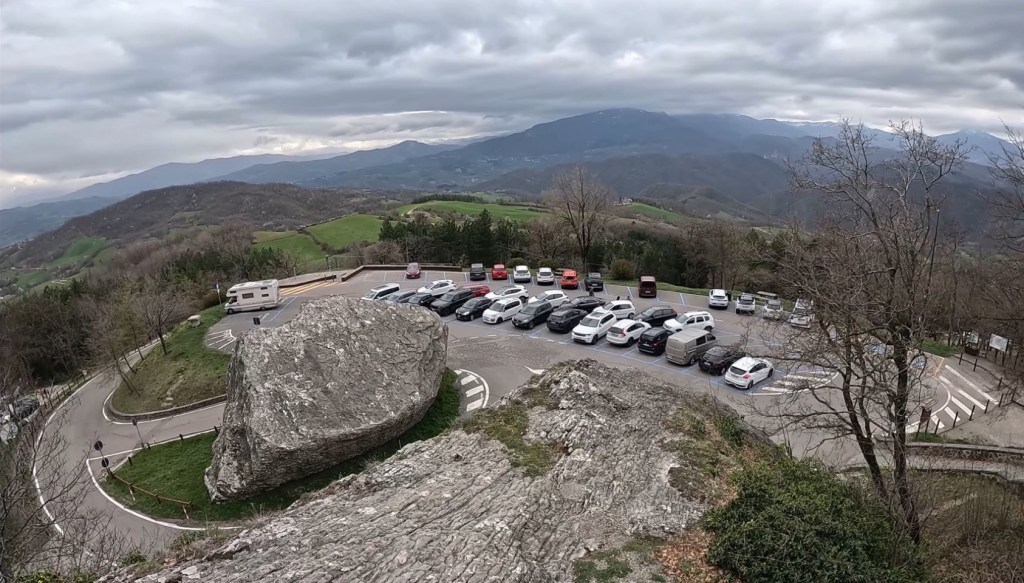 Cesty v horách jsou v Itálii občas výzvou a vyžadují jak řidičský um, tak i trochu štěstí. Medva2 Me nazývají podobné cesty kozími stezkami – úzké, kamenité, v strmém terénu. Ještěže na konci takové cesty je parkoviště. Ale nastupující noc přinesla sníh, což byla po teplém pobřeží docela výrazná změna.