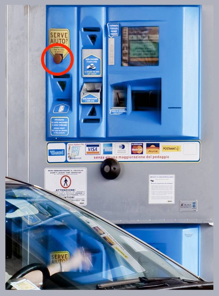 Po stisknutí tlačítka označeného jako „AIUTO-HELP“, „RICHIESTA DI INTERVENTO“ nebo „ASSISTENZA“ se vám buď někdo ozve a vysvětlíte mu problém, nebo ihned vyjede lístek a závora se zvedne. Lístek, neboli účtenka, obsahuje pokyny pro dodatečné zaplacení mýtného.