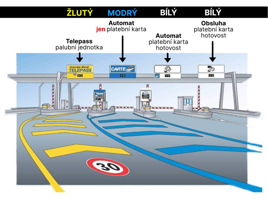 • Žlutý pruh (automat): Výhradně pro Telepass, tedy vozidla s palubní jednotkou