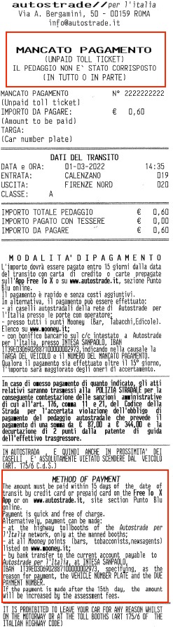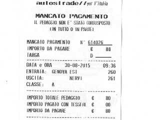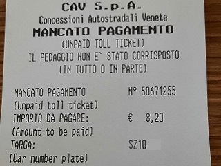 1. Pokud se platba kartou nezdaří, na účtence, který stroj vydá, bude uvedeno „MANCATO PAGAMENTO“, což v překladu znamená „nezaplaceno“. V takovém případě musí řidiči mýtné uhradit zpětně. Mnoho řidičů však účtenku zahodí či založí, protože si myslí, že jde o obyčejný doklad o platbě .