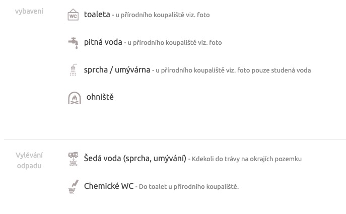 Počítá se s využitím obecního vybavení u přírodního koupaliště (zdarma dostupné). Je zde venkovní sprcha a jednoduchá sanitární chatka se záchody a venkovními umyvadly. Tohle vybavení naleznete podél severního břehu, na kraji kempovací louky.