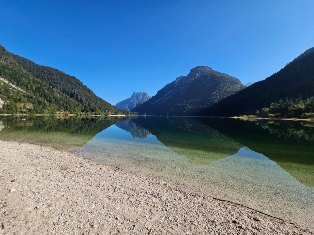 Od parkoviště je to k břehu jezera skutečně jen kousek a samotný břeh je dobře schůdný. Po cestě lze pokračovat dále a dojít až těsně k bývalé pevnosti Batterie Sella Predil u silnice vedoucí do Slovinska. Ostatně tato část jezera je popsána v článku Tip na místo u jezera při cestě do Itálie.