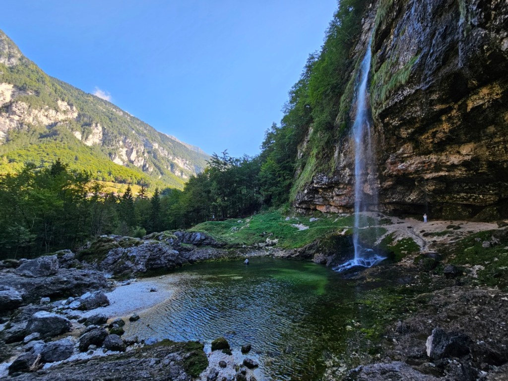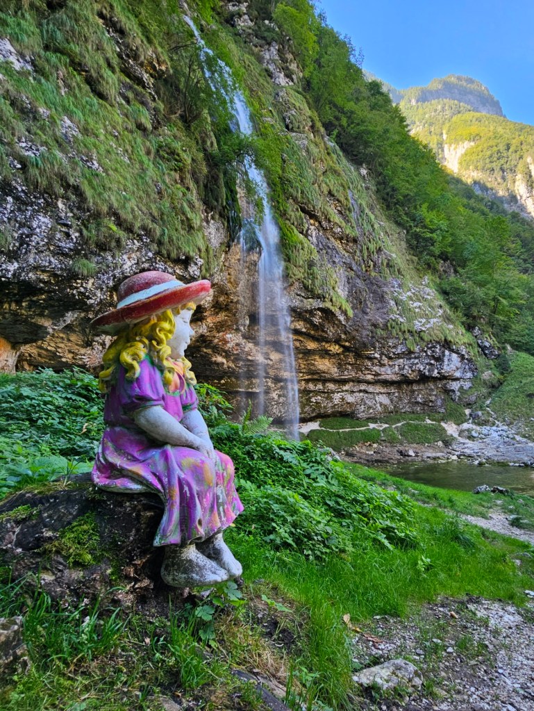 Po delší vycházce po březích jezera jsme pokračovali po silnice SP 76 dále, do sedla a kolem lyžařského střediska Sela Nevea zase dolů. Sjezd ze sedla do údolí je působivý, strmý a dlouhý, počítejte s tím, že brzdy se zde docela rozpálí. U restaurace Trattoria Al Fontanon di Guriude je parkoviště, které je zároveň dobrým výchozím bodem pro malý výlet ke zdejšímu vodopádu Fontanon di Goriuda. Padající sloupec vody lze celý obejít, cesta vede i za ním. K vodopádu vede lesem cesta s mnoha namalovanými kameny, nudit se tedy tady nikdo nebude.