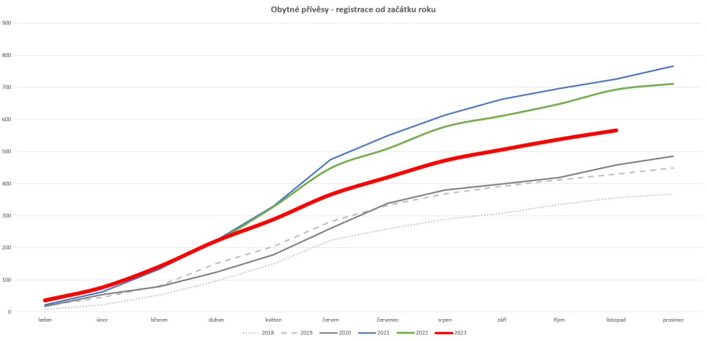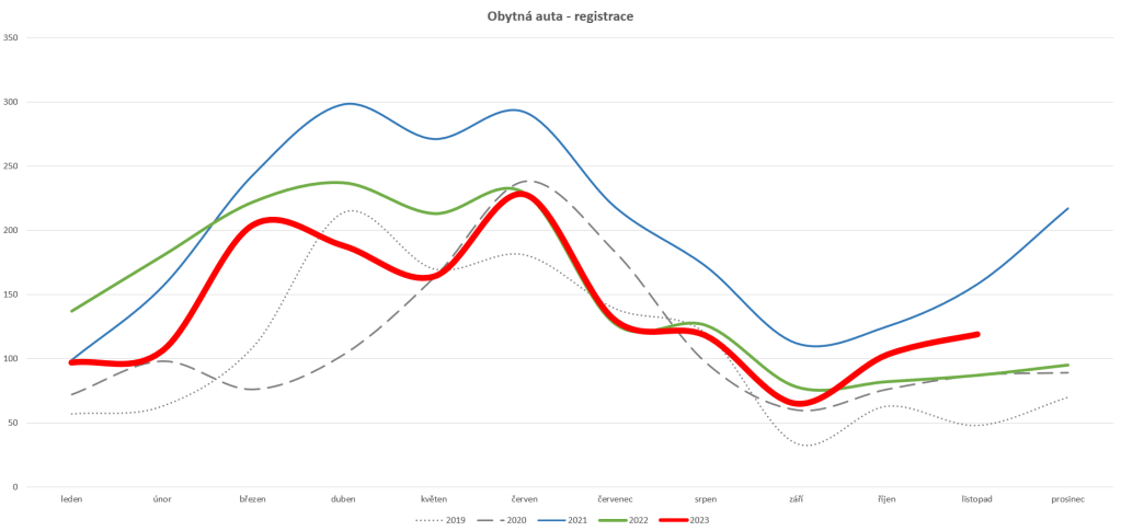 Podobně jako v říjnu, tak i v listopadu 2023 je 119 nových obytných aut v historii registrací druhou pro daný měsíc druhou nejvyšší hodnotou. Více aut bylo v tomto kalendářním měsíci registrováno jen v listopadu 2021, tehdy se jednalo o 158 vozidel. Před rokem, v listopadu 2022, bylo registrováno 87 vozidel a jedná se tak o výrazný 37% meziroční nárůst. Dokonce při porovnání se situací před pěti lety, tedy s listopadem 2018, zde máme více jak trojnásobný nárůst v registracích nových obytných aut. Tehdy se registrovalo jen 39 vozidel, tedy jen třetina aktuálního počtu.