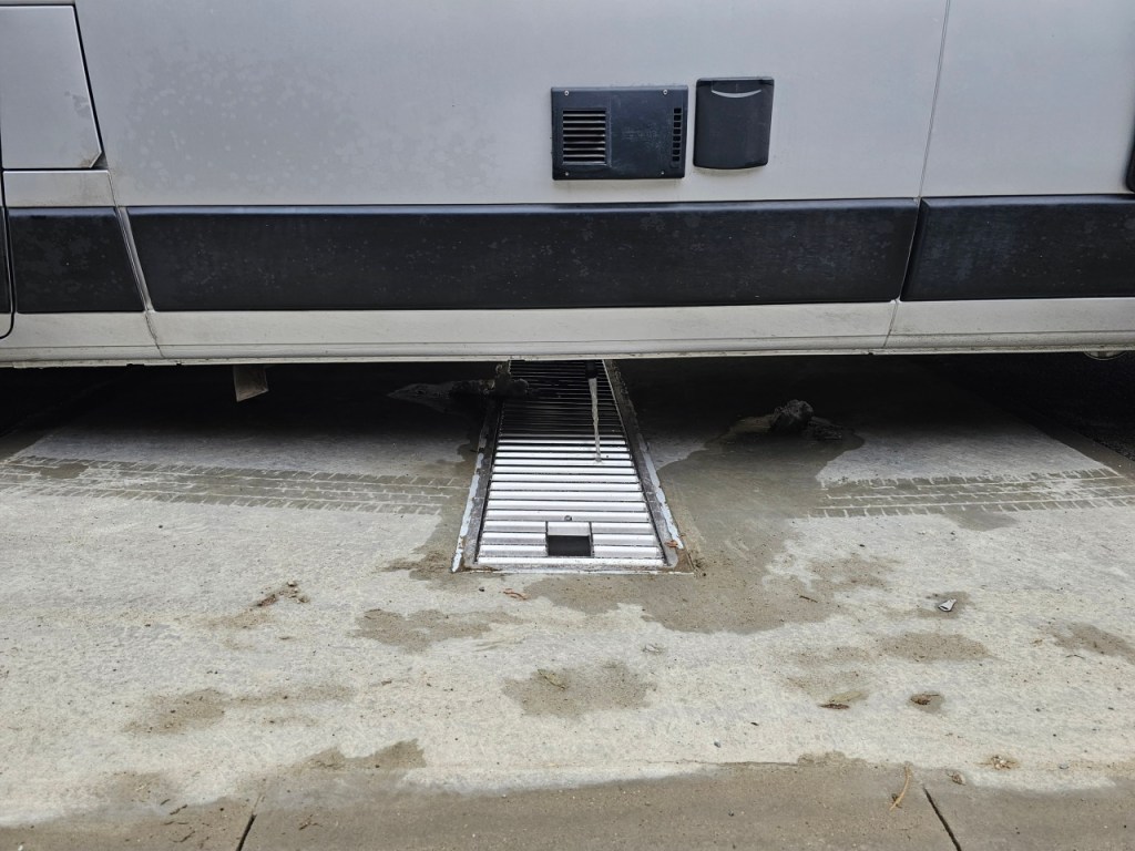 Servisní místo je vybaveno dvěma sloupky a vozovkou výpustí (žlabem) pro šedou vodu od německé firmy Beckmann (https://www.beckmann-gmbh.de/anwendungen/camping-wohnmobilstellplaetze/), dodáno společností TOP-STELLPLATZ (neboli Finaso, https://www.top-stellplatz.cz/).