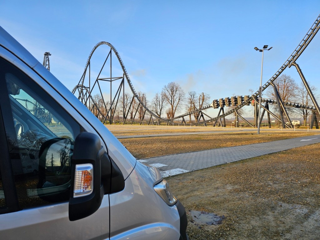 Parkování stojí dalších 20 zlotých, pokud nechcete zůstat přes noc. Počítejte s tím, že vás obsluha parkoviště pošle v obytném voze na samotný konec parkoviště a k bráně parku se tak trošku projdete. Ale ani tak to není daleko. Lístek pro výjezd z parkoviště si lze za zmíněných 20 zlotých koupit na pokladně a nebo v automatu. Pokud ale chcete zůstat přes noc na místním stání pro karavany, je nutné si připravit 99 zlotých. Více na https://energylandia.pl/cs/hotel/pole-namiotowe-i-camping-energylandia-2/