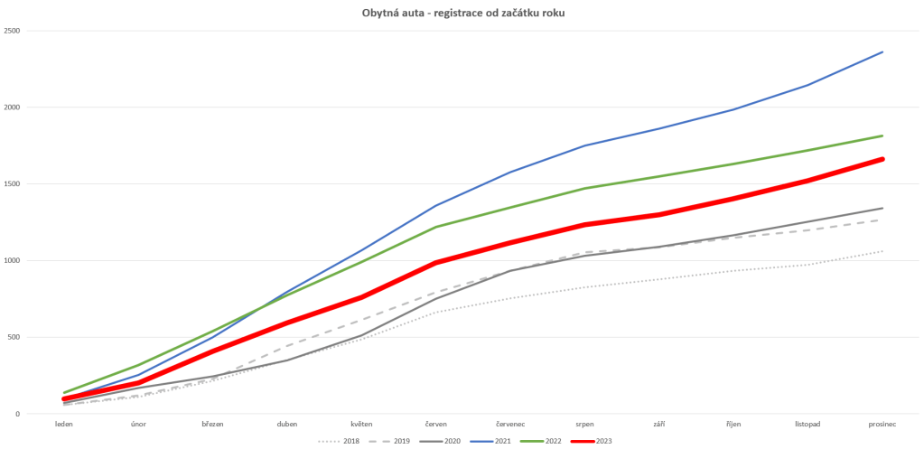 Podobně jako v říjnu či listopadu, tak i prosinec 2023 je se svými 141nově registrovanými obytnými auty druhým nejlepším měsícem v historii. Více aut bylo v tomto kalendářním měsíci registrováno jen v prosinci 2021, tehdy se jednalo o 217 vozidel. Před rokem, v listopadu 2022, bylo registrováno jen 95 vozidel a jedná se tak o výrazný 48% meziroční nárůst. Za celý rok 2023 bylo jako nových zprovozněno 1.663 obytných aut, což z uplynulého roku činí třetí nejlepší rok v historii ČR. Celkově sice došlo k meziročnímu poklesu o osm procent, ale zde je třeba zdůraznit, že období let 2020 až 2022 byly silně ovlivněny nebývalou poptávkou po obytných autech vyvolanou omezeními po dobu covidové pandemie. Při porovnání s posledním normálním rokem 2019 došlo k nárustu trhu o více jak 31%!