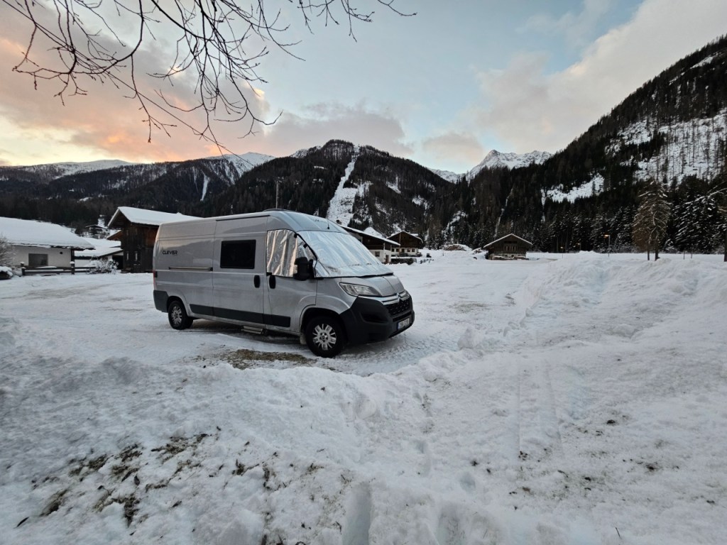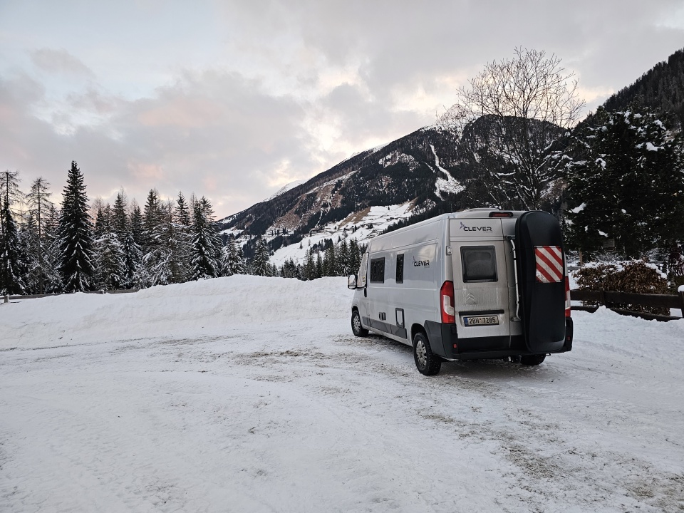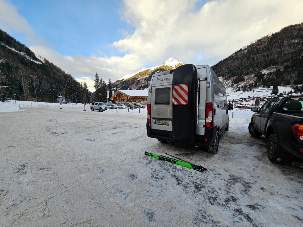 Na začátek snad jen upozornění. V Tyrolsku je obecně zakázané spaní přes noc v obytných vozidlech a mimo vyhrazené plochy při turistických pobytech. Na místo přijíždíme až později večer, snažíme se na sebe nijak zvlášť neupozorňovat (nicméně přední půl kabát nasazujeme) a ráno odcházíme lyžovat, zatím nám to vždy prošlo.