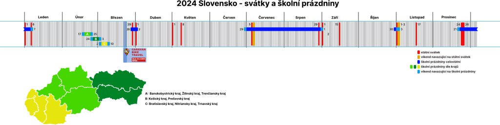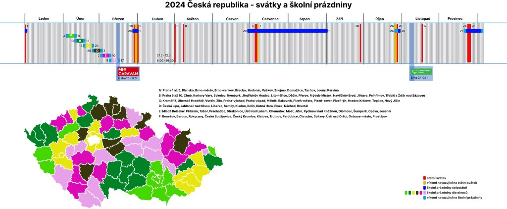 Bohužel v ČR bude tento rok výstava Caravaning Brno v trochu nevhodném termínu, na začátku podzimních prázdnin. BVV přesunulo výstavu Caravaning Brno na druhý víkend v listopadu. Z kalendáře je vidět i velká anomálie Česka ohledně jarních prázdnin. Zatímco ostatní země si vystačí s třemi termíny (Rakousko a Slovensko) a téměř čtyřikrát větší Polsko se spokojí s třemi, tak u nás máme hned šest termínů a mapa naší republiky vypadá spíše jako rozparcelované políčko s odlišným porostem na každém kousku….