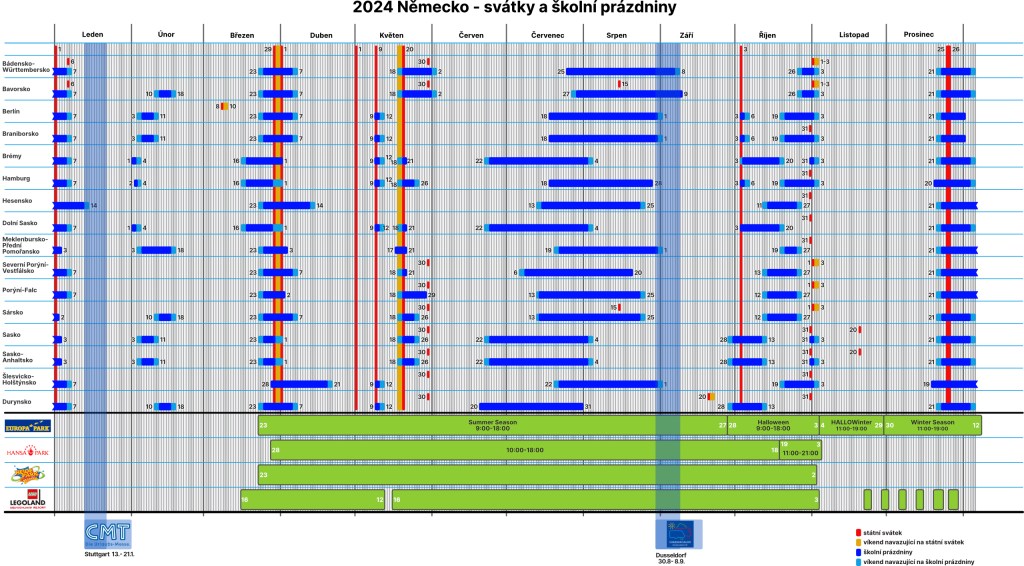 Mimo vlastních svátků a prázdnin jsou v kalendářích zachyceny i otevírací doby zábavních parků, pokud tedy v dané zemi jsou. A k tomu i termíny konání významnějších karavanistických výstav v dané zemí.