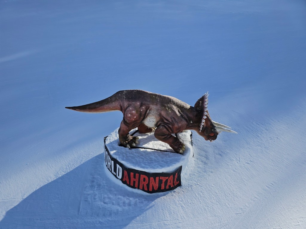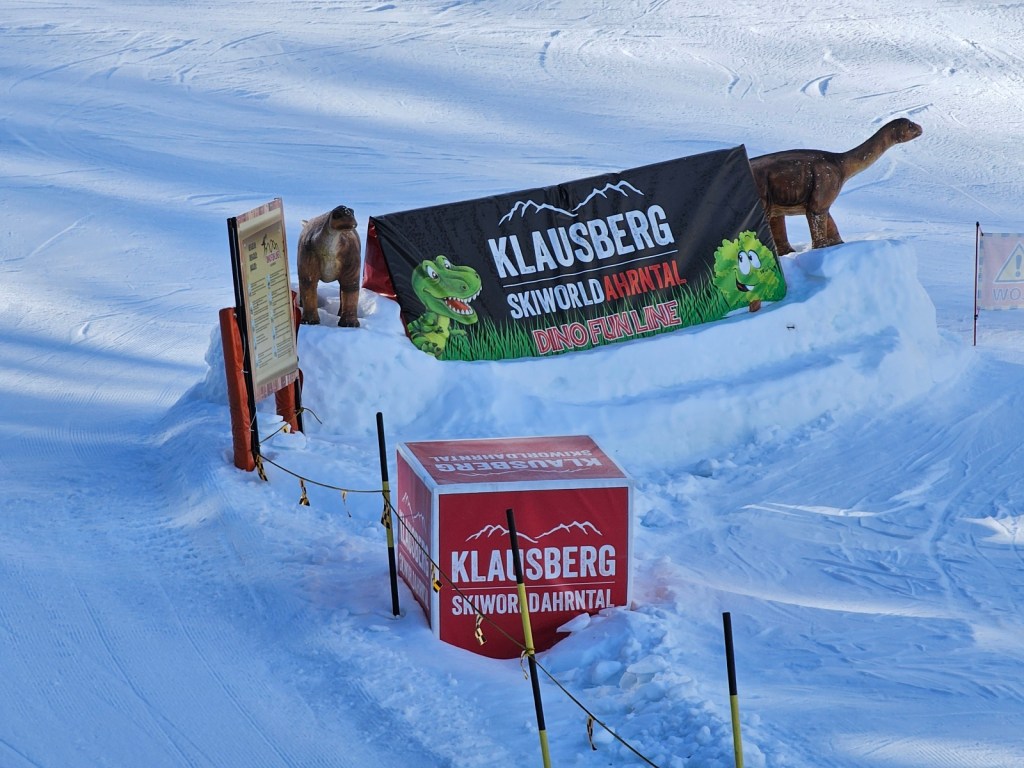 Na vrcholu šlo v době naší návštěvy zhlédnout i výsledek festivalu soch. Jen tedy vršek s vyhlídkou byl dost pokryt ledovou krustou a výstup i sestup vyžadovaly určitou opatrnost. Festival zde pod názvem Klausberg Ice Games probíhal od 15. do 18. ledna, umělci měli tyto čtyři dny na to, aby velkého bloku sněholedu 3 x 3 x 3 m vytvořili sochu. Umělecká díla obvykle vydrží až do konce března, ale kdoví, jak to bude v tomto teplém roce. Navíc v předchozích letech byli k vidění zajímavější kreace než letos, jak se lze přesvědčit na stránkách skiareálu: https://www.skiworldahrntal.it/en/360-experience/attractions/ice-games