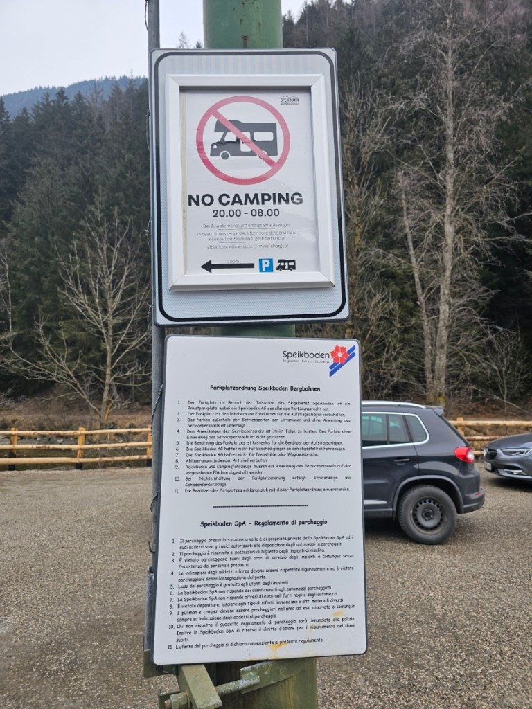 Areál Speikboden má sice velké parkoviště, a dokonce i vyčleněnou plochu pro obytná vozidla ve vzdálenější části, ale hodně blízko parkovací plochy vede rušnější silnice. Není tedy úplně vhodný pokud preferujete klid, nicméně s místem zde také není problém. Jen celá ta plocha se dokázala během dne zaplnit, na noc by měly obytky stát až v té zadní části pro autobusy. V letní sezóně se za místo zde platí..