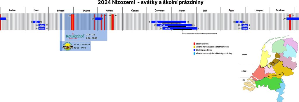 Přehled o státních svátcích i prázdninách si lze udělat z tohoto obrázku. Nizozemí je pro potřeby školství rozděleno na tři části a některé delší prázdniny, tedy obdoba našich jarní, letní a podzimní jsou v těchto částech v odlišných datech. V Nizozemí také není jednotná doba hlavní dovolené, ale pro jednotlivé regiony jsou stanoveny doporučené datumy. Vše je zachyceno přehledně na těchto kalendářích.