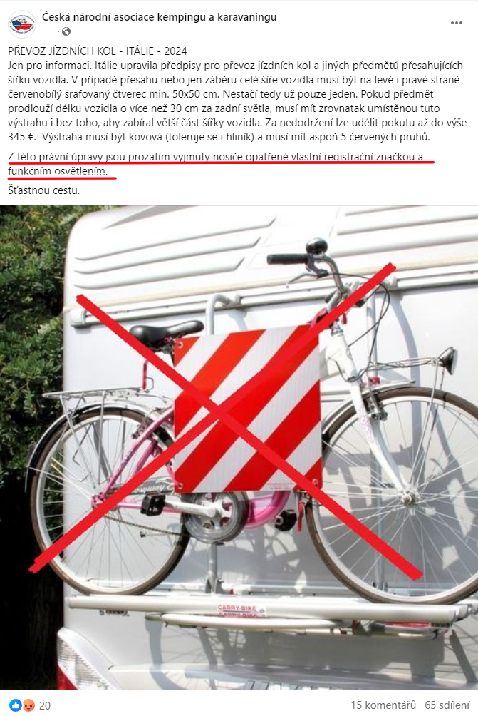 Změny v Itálii někteří špatně pochopili a uveřejnili informace, které jsou nepřesné a nesprávné. Příkladem budiž právně neexistující Česká národní asociace kempingu a karavaningu (CNACC) Ta se ve svém příspěvku snaží vzbudit zdání, že v Itálii aktuálně došlo ke změně pravidel a je nově povinné používat při přepravě kol vzadu výstražnou tabulku v počtu jednoho nebo dvou kusů. To by samo o sobě nevadilo, byť to žádná novinka není. Mnohem horší je, že tvrdí, že z této povinnost jsou vyjmuty nosiče opatřené vlastní registrační značkou a funkčním osvětlením a na dovršení všeho přikládá obrázek, na kterém je červeně škrtnuta výstražná tabulka na zcela jiném typu nosiče kol.