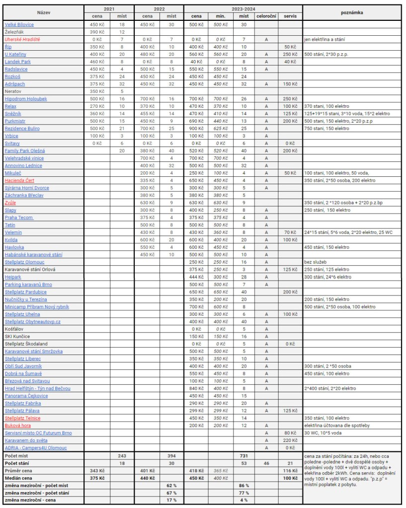 Vydání nového katalogu je zároveň příležitostí podívat se na vývoj v České republice trochu podrobněji a zjistit, kolik stání přibylo či jaká je jejich cena pro uživatele. Všechny stellplatzy z katalogu, plus několik dalších (ta, která v katalogu chybí, jsou označena červeně) jsou tak v tabulce, spolu s údajem o počtu míst a ceně za stání.