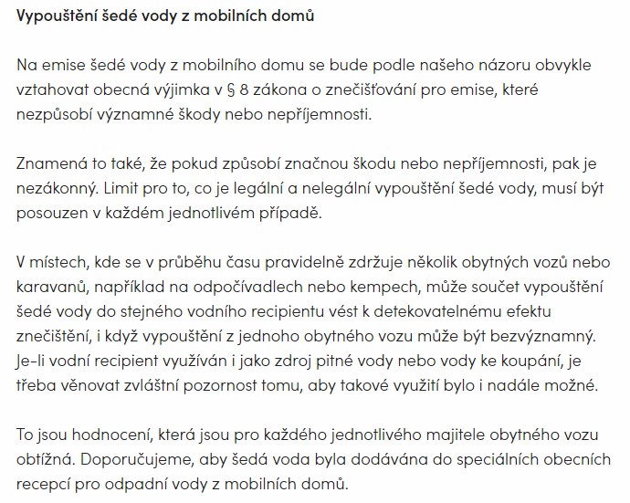 Podle názoru této Agentury, vypouštění šedé voda z obytných aut patří pod všeobecnou výjimku v paragrafu 8 zákona o znečištění, protože nezpůsobí významné škody nebo nepříjemnosti . Norská agentura pro životní prostředí přesto nedoporučuje vypouštět šedou vodu z obytných aut volně do přírody a nabádá k pečlivému zvážení všech okolností.