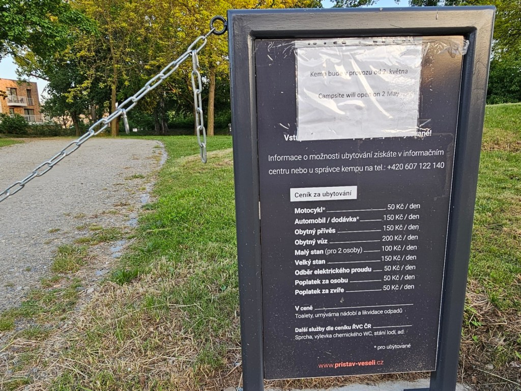 Ceny za pobyt jsou stále poměrně příznivé, za obytné auto se platí 200 Kč, na dalších 50 Kč přijde každá osoba i odběr elektrického proudu. Rodina s dvěma dětmi zde tedy za noc nechá 450 Kč včetně odběru elektrického proudu. Další poplatky se platí za sprchu a využití výlevky pro chemické WC, 30 a 20 Kč přes přístavní kartu).