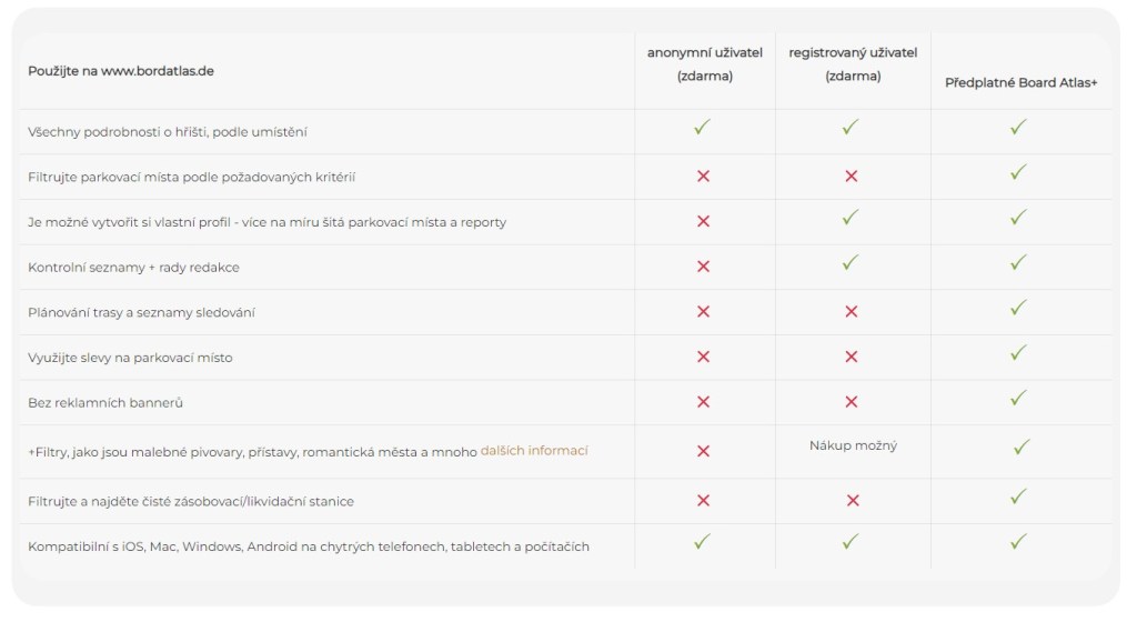 Pro karavanisty, kteří si chtějí pohodlně naplánovat další cestu, používat filtry, vytvářet seznamy a používat plánování je určeno předplatné Bordatlas+ (nabídka 8,99 €/rok – po 50 % slevě). Data si pak můžete stáhnout i do navigačního zařízení. Předplatné má i nějaká další výhody, například poukazy na stání v hodnotě až 600 €, více na informací na www.bordatlas.de/bordatlas-plus