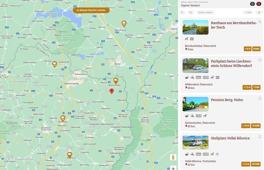 Základní vyhledávání stání lze provést podle místa místa, PSČ a/nebo regionu – a je zdarma . Bezplatně si také můžete přečíst tipy a cestopisy od redakce, které jsou navíc průběžně doplňovány. Základní vyhledávání je dostupné na adrese https://www.bordatlas.de/app/