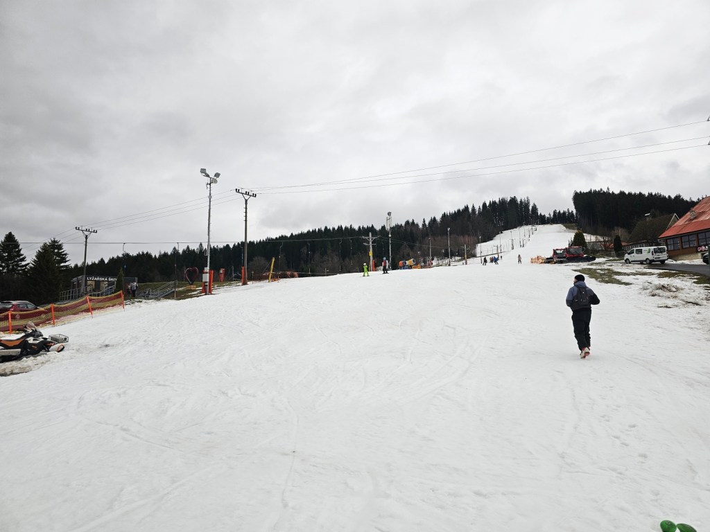 Bídně, normální by bylo za takových podmínek areál zavřít. V horní části byl vydřený až na trávu a méně zkušeným lyžařům dalo vyhnutí se tomuto úseku docela zabrat. V dolní části pak postupem doby začala dominovat rozjetá měkká břečka. Takže výhodu byly snad jen relativně krátké fronty (spíše žádné) i krátká čekací doba ve vedle ležící restauraci na občerstvení. I přes nižší návštěvnost byla zarážející nečinnost obsluhy vleku, která začátečníkům nijak výrazně s nástupem nepomáhala a spíše dění zpovzdálí sledovala. I to je oproti často zmiňovanému Rakousku podstatný rozdíl.
